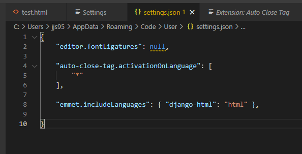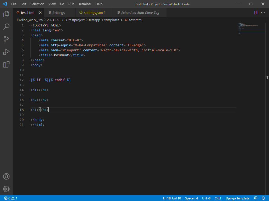 여기서의 핵심은 auto-close-tag라는 설정이 django-html 혹은 모든 파일에 적용 시켜야 한다는 것입니다.