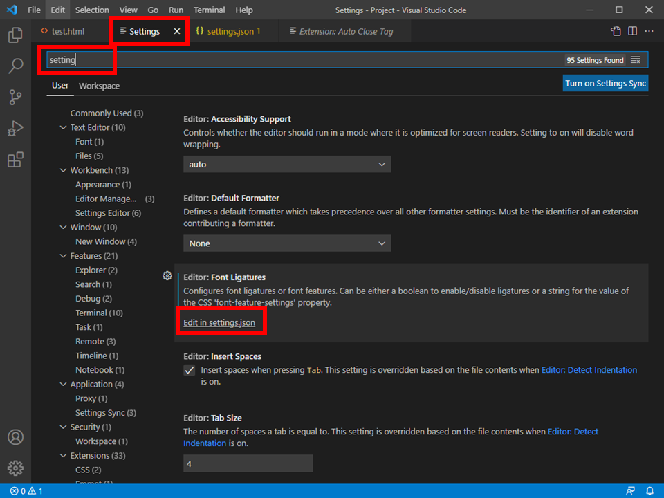 이제 setting로 검색 하여 Edit in settings.json을 눌러줍니다.