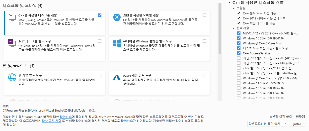 Microsoft C++ Build Tools를 다운로드 해줍니다.