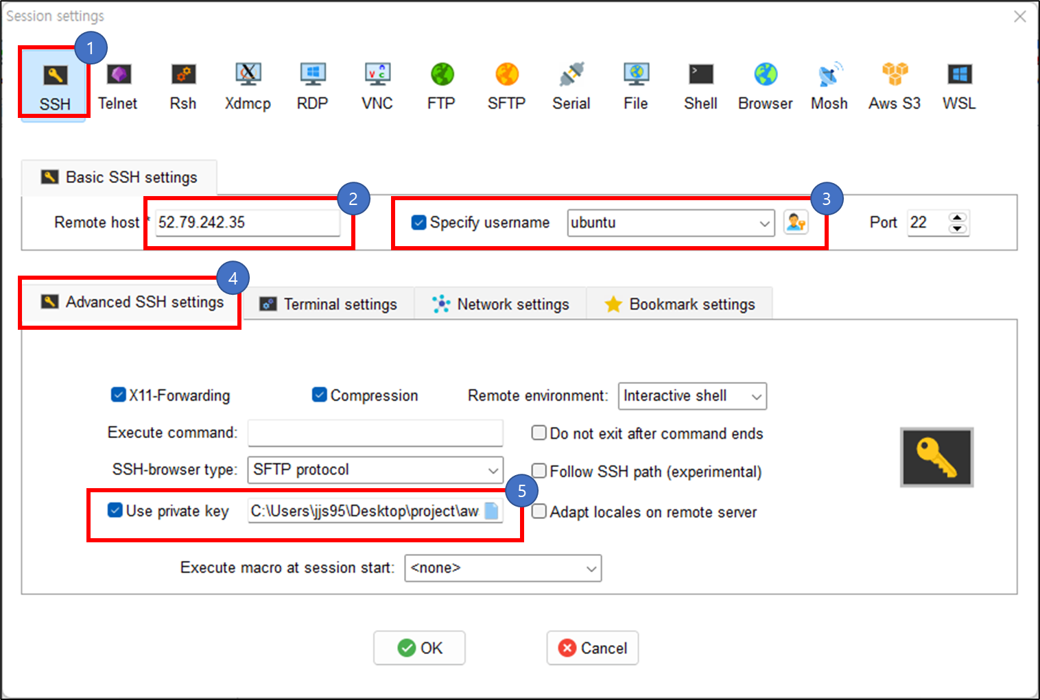 5. ★ Use private key를 체크하고 Ec2 인스턴스를 만들 때 받았던 pem 파일을 등록해주세요.