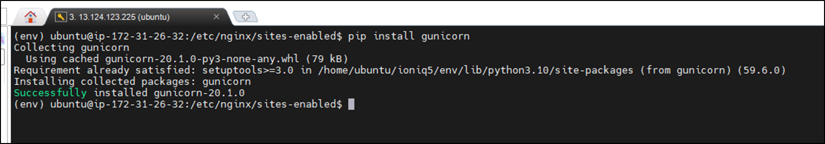 가상환경을 실행해준 뒤 gunicorn을 설치하여 줍니다.