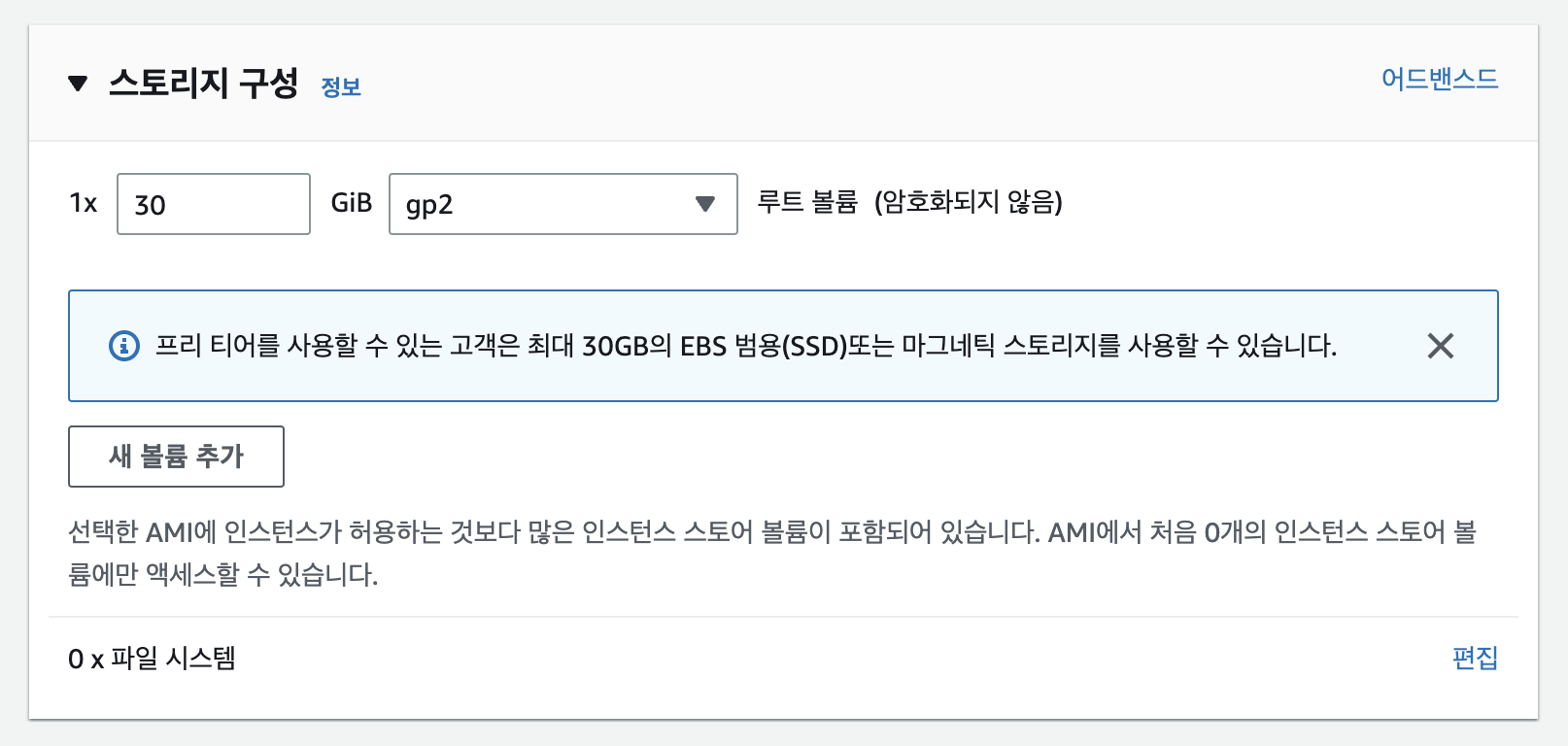 스토리지는 도커에 설치할 이미지들을 대비하여 프리티어의 최고 용량으로 설정(개인적인판단)