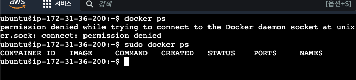 하지만 명령어를 도커 명렁어 모두 sudo를 넣어주어야 한다.