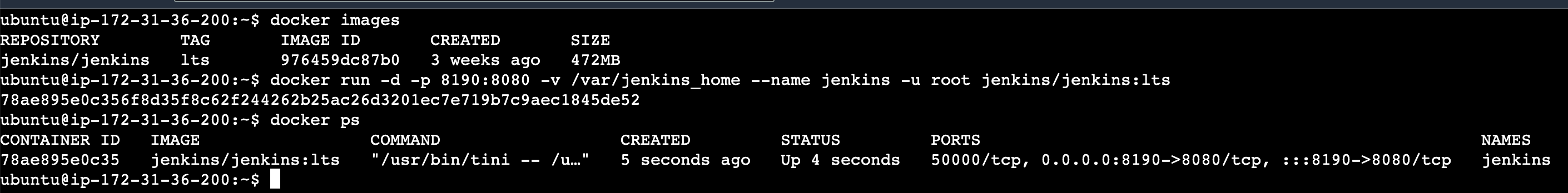 docker run -d -p 8190:8080 -v /var/jenkins_home --name jenkins -u root jenkins/jenkins:lts
