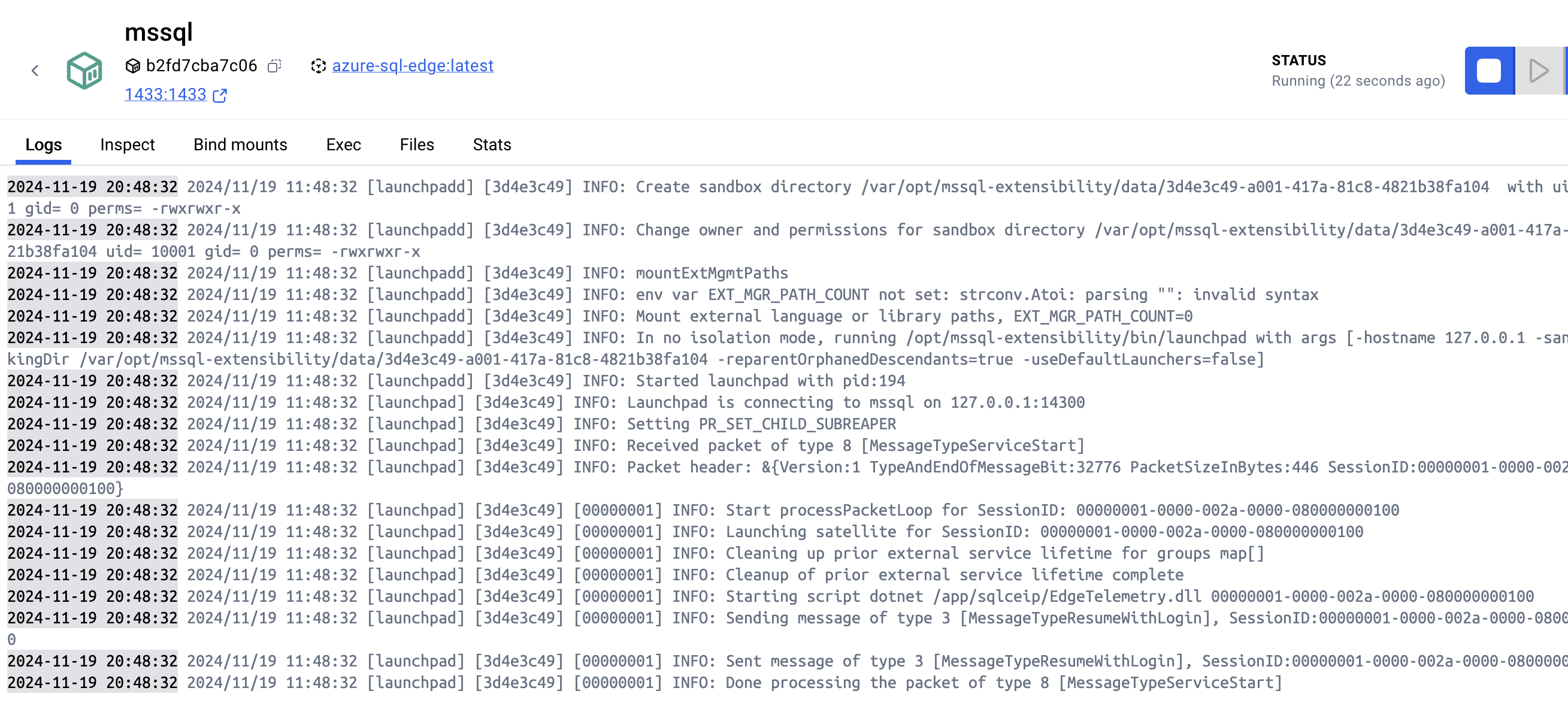 docker run --cap-add SYS_PTRACE -e 'ACCEPT_EULA=1' -e 'MSSQL_SA_PASSWORD=$PASSWORD' -p 1433:1433 --name mssql -d mcr.microsoft.com/azure-sql-edge