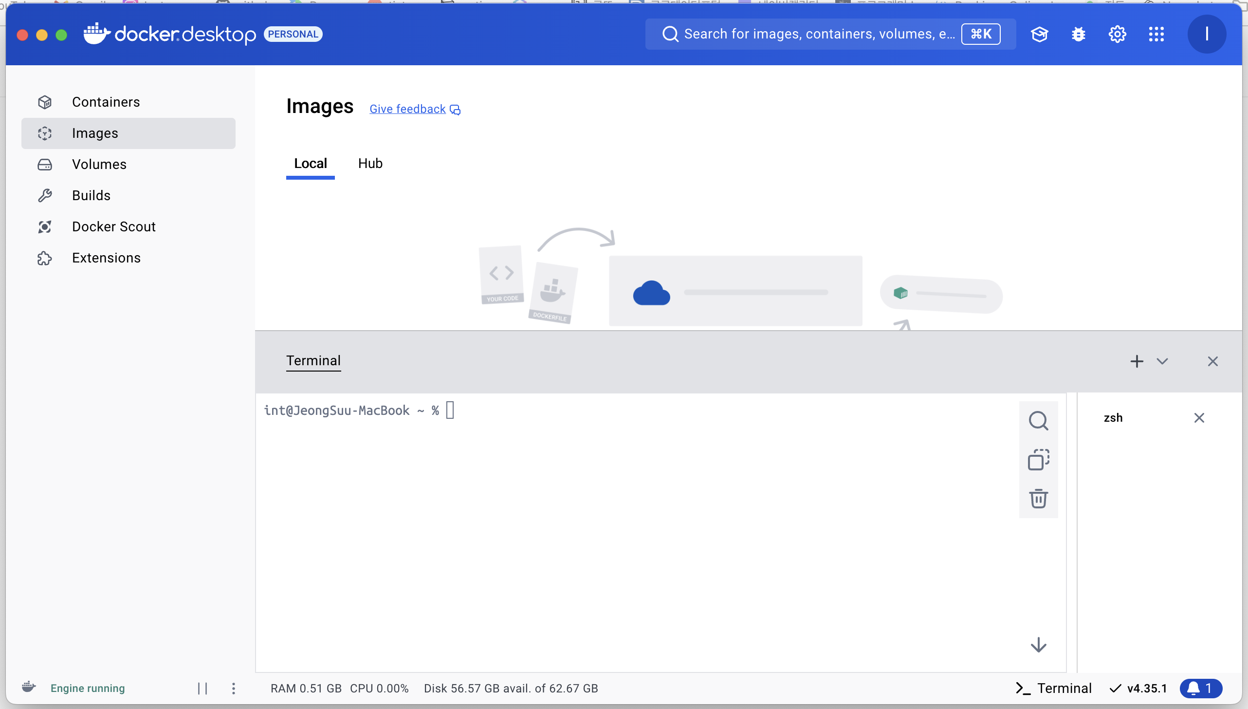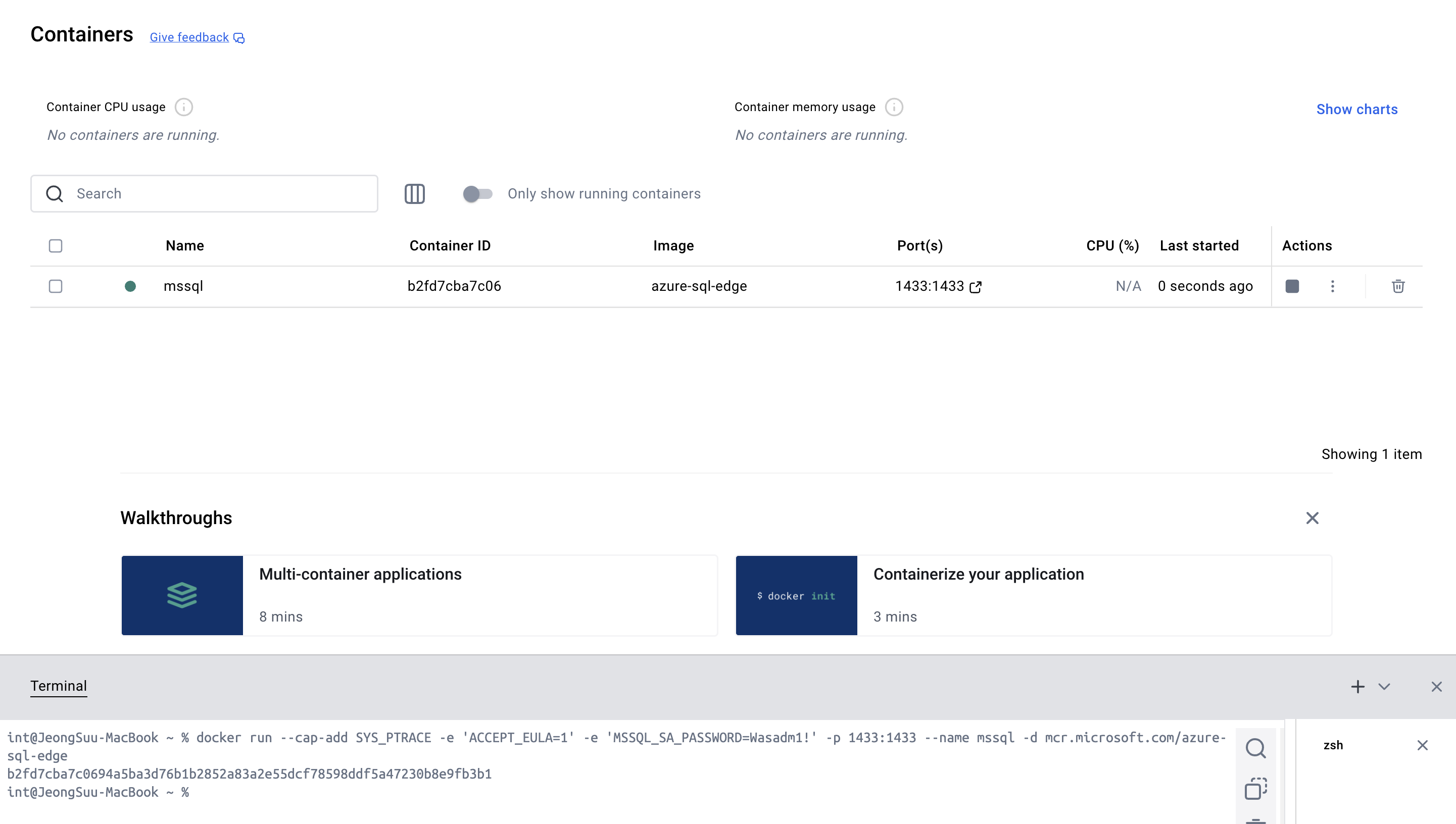 docker desktop를 실행하고 좌측 하단의 terminal을 열어 명령어를 입력해 주어야 한다.