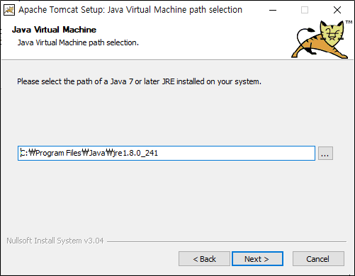 자바 실행환경 선택하는 화면입니다. 설치되어있는 java로 설정되어있습니다. 이대로 진행합니다. Next