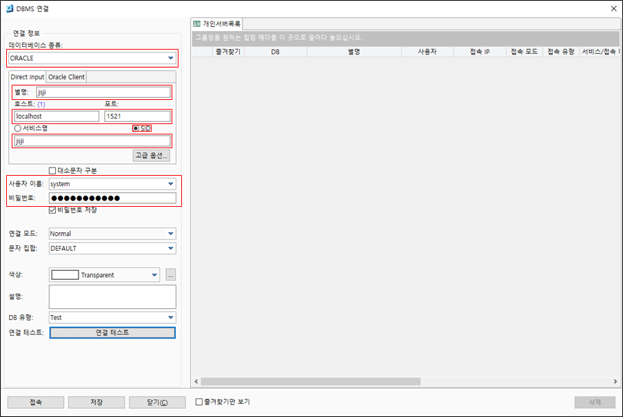 여기서 Oracle를 설치할 때의 정보를 입력하여 데이터베이스 연동을 해줍니다.