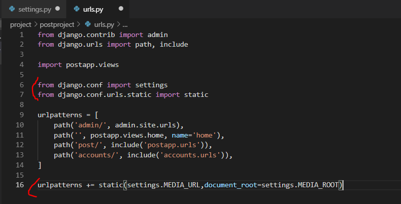 postproject/urls.py에 들어가서 url을 수정하여 줍시다.