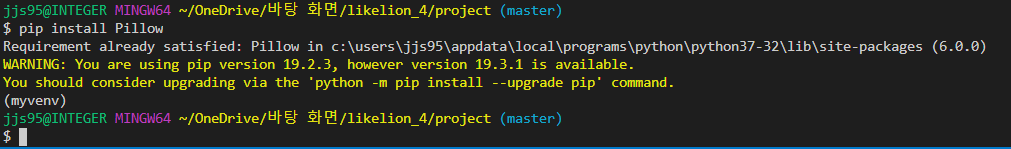 먼저 media파일과 static파일을 사용할 수 있게 pillow를 설치하여 줍시다.