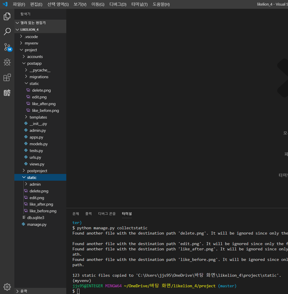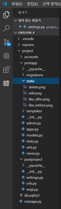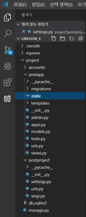 그렇다면 이제 postproject아래에 static라는 폴더가 새로 생기면서 파일들이 모였습니다!!