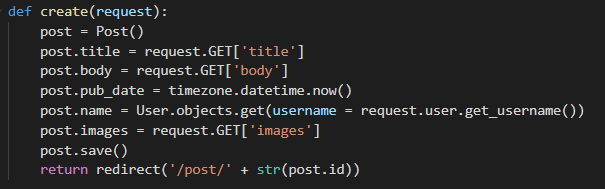 def create(request): post = Post() post.title = request.GET['title'] post.body = request.GET['body'] post.pub_date = timezone.datetime.now() post.name = User.objects.get(username = request.user.get_username()) post.images = request.GET['images'] post.save() return redirect('/post/' + str(post.id)) |