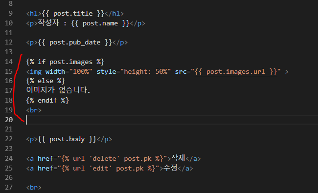 {% if post.images %} <img width="100%" style="height: 50%" src="{{ post.images.url }}" > {% else %} 이미지가 없습니다. {% endif %} <br> |
