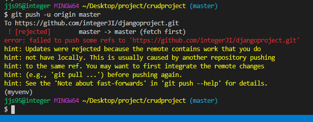 정상적이라면 git pull을 사용해 지금 파일들과 합쳐주고 다시 git push 해주어야 하는데