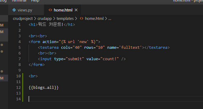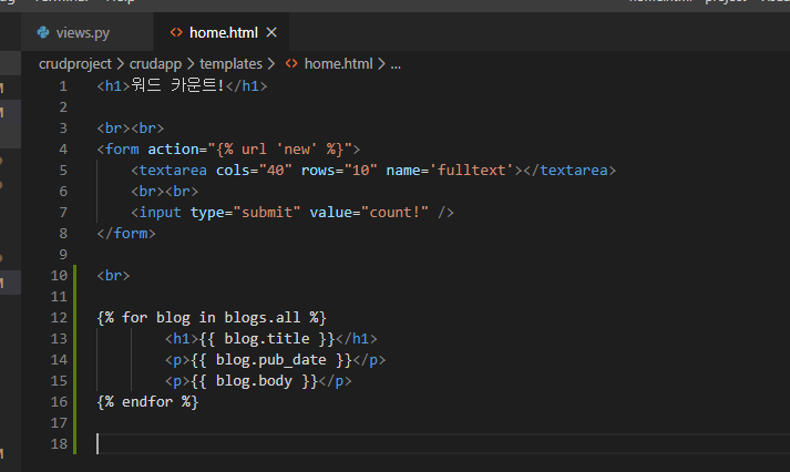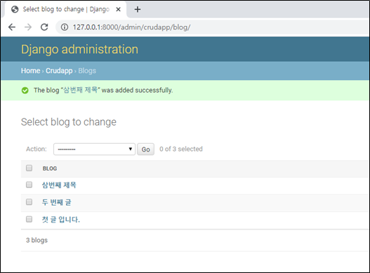 기존에 있던 워드카운트와 함께 crudapp.Blog.objects가 출력됩니다.
