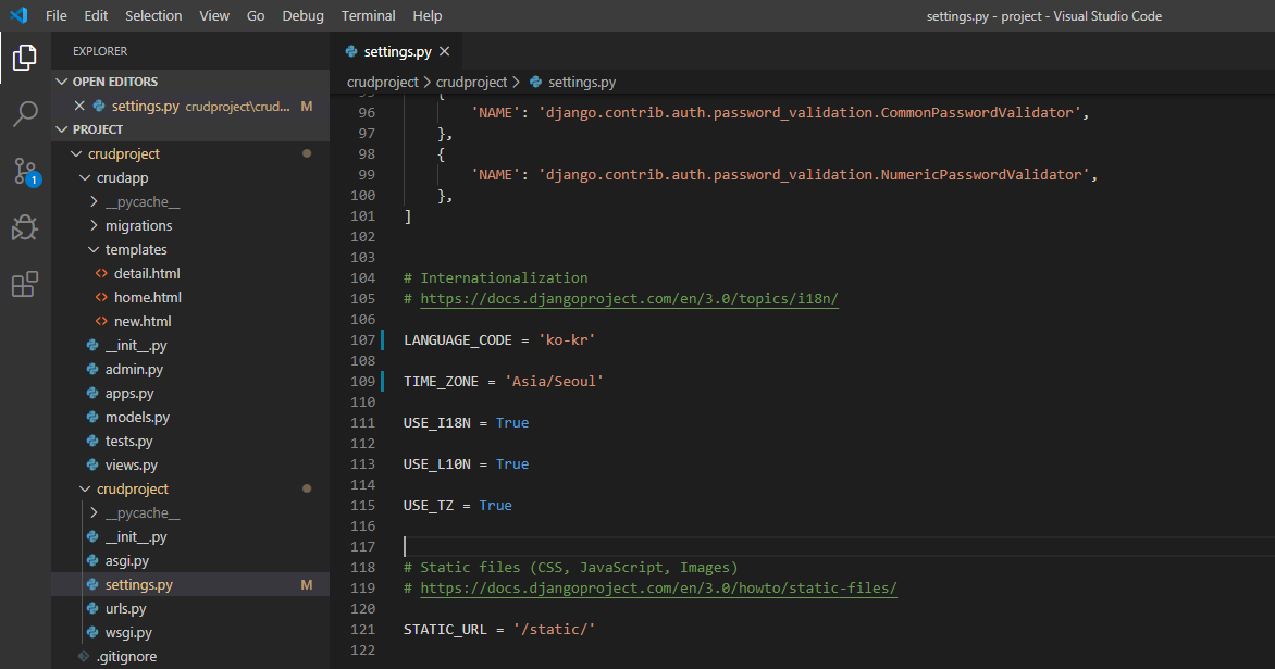 crudproject의 setting.py에 107 ~ 115번 줄을 보면 기본값은 "LANGUAGE_CODE = 'en-us'"와 "TIME_ZONE = 'UTC'"으로 되어있습니다.