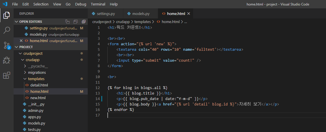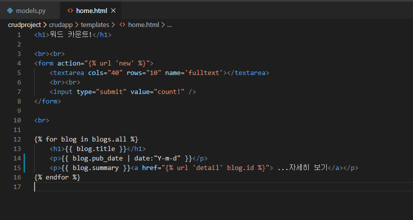 home.html에서는 blog.title를 blog.summary를 불러옵니다.