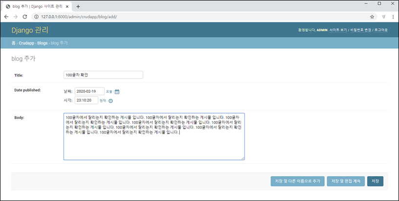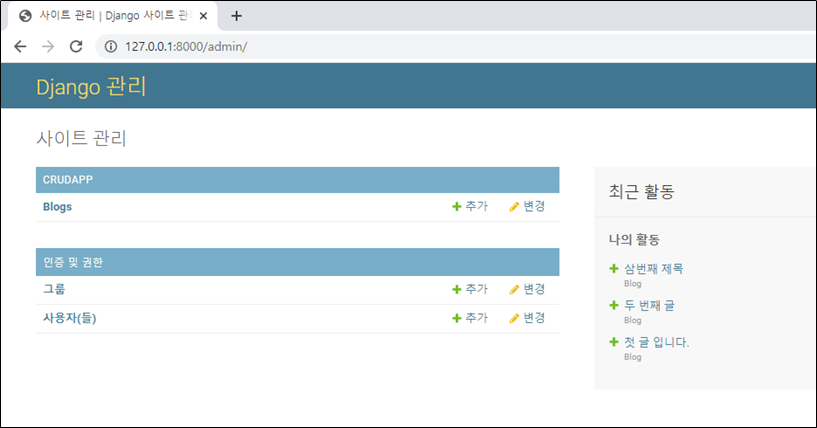admin페이지 및 django에서 지원하는 언어가 한글로 변합니다.