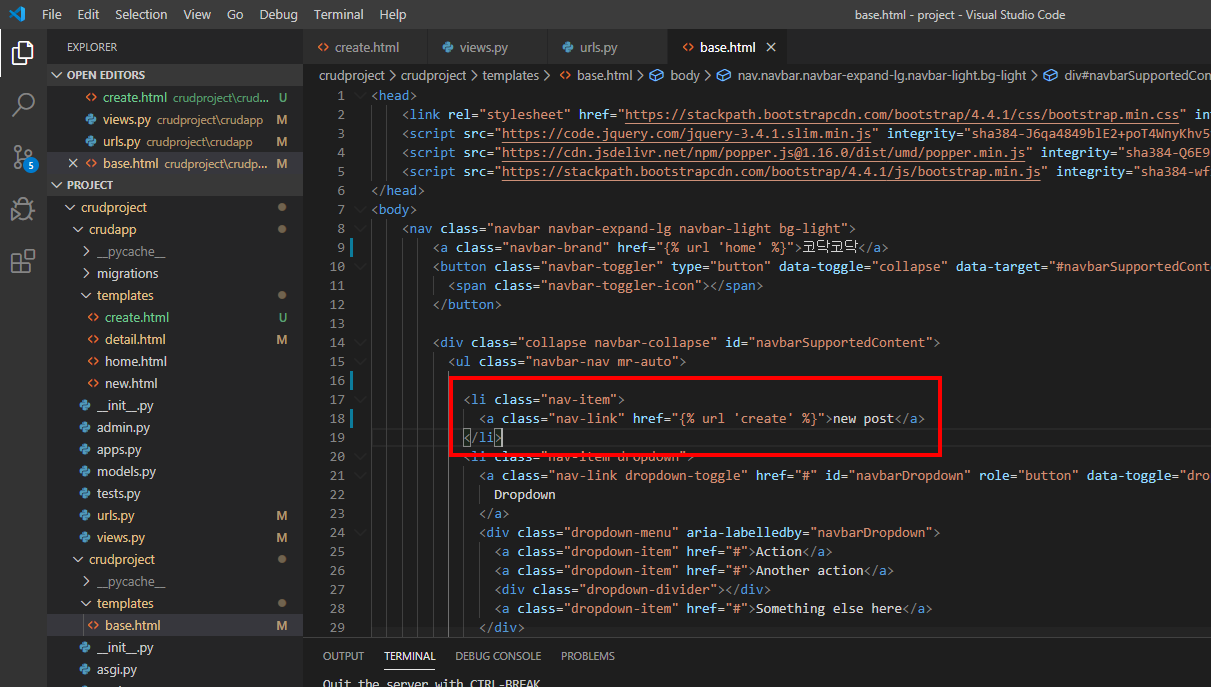 base.html에 link칸을 new post로 바꿔주었습니다.